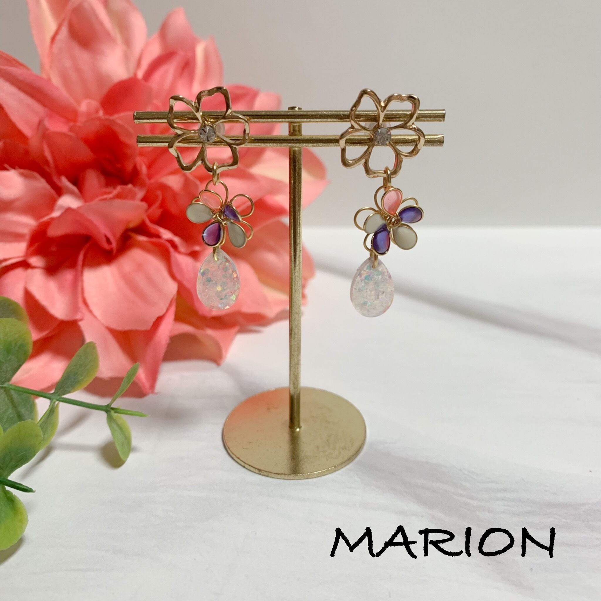 ピアス 1点物 他人と被らない 可愛い 可愛いアクセサリー 可愛いピアス 花 花モチーフ フラワーモチーフ 雫